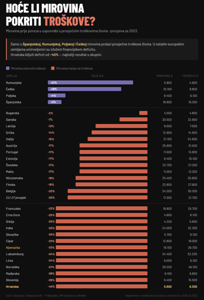 Većina Europljana odlazi u mirovinu s mirovinom koja zapravo ne pokriva njihove račune. Hrvatska je na začelju liste s 40% manjom mirovinom od prosječnih troškova. Njemačka, jedno od najbogatijih gospodarstava na svijetu, ima 33% manje mirovine. Samo četiri zemlje na cijelom priloženom grafikonu imaju mirovine koje premašuju osnovne troškove života.